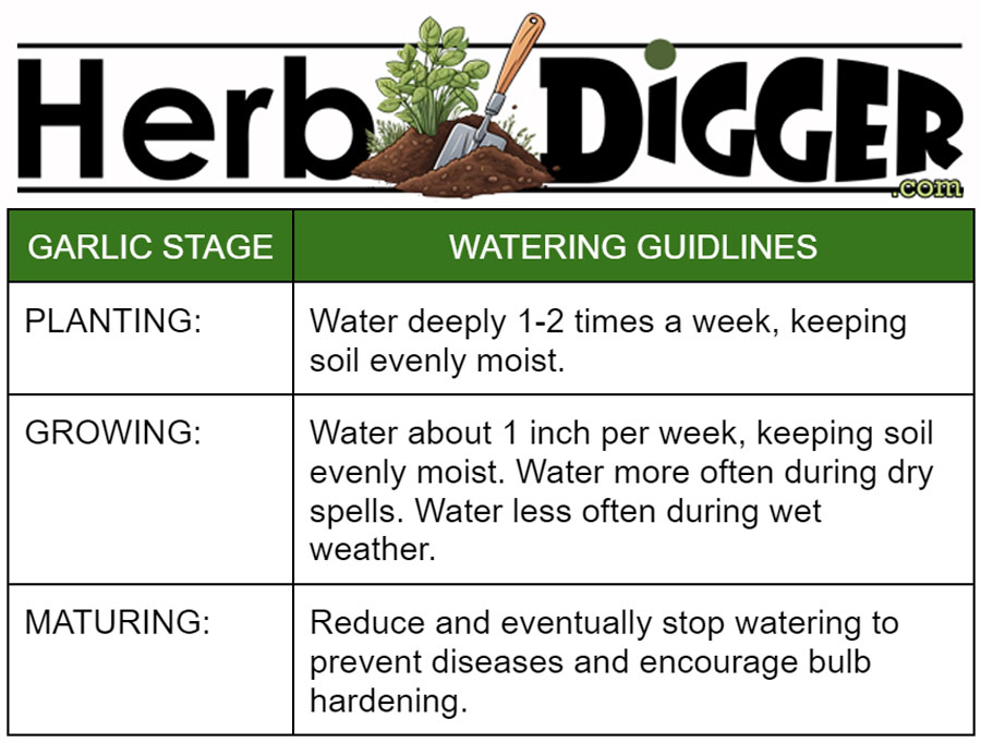 Garlic needs approximately 1 inch of water per week. Maintaining consistent soil moisture is vital, especially during dry spells. Overwatering should be avoided to prevent fungal issues or bulb rot.